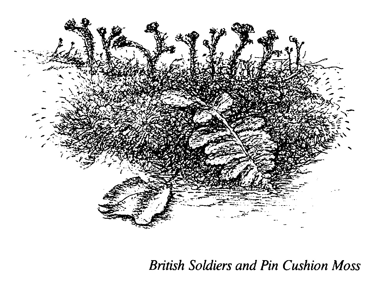 Notice patches of moss at various locations along the trail. Tree bark and rocks support mini ecosystems of mosses and lichens. Moss is a primitive plant that, like ferns, reproduces by spores, not seeds. It thrives during rainy periods in March and April when the warming sun reaches the forest floor. Some mosses form spongy mats several inches thick, upholstering logs and rocks. Varied textures and shades of green contrast with the drab colors of mid-winter.